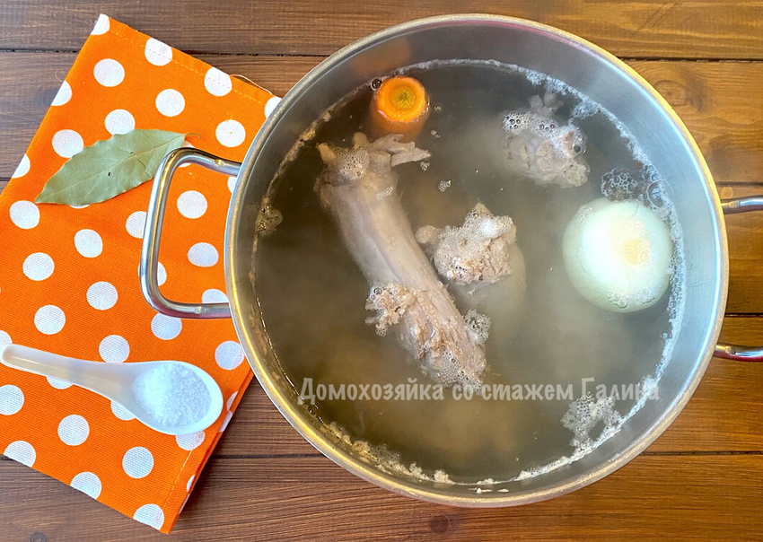 Итак, для начала разрезаем шейки на части и выкладываем их в кастрюлю. Заливаем горячей водой и варим до появления пены. Снимаем ее, ставим огонь на минимум, добавляем лук и морковь. Прикрываем крышкой и варим около 3 часов.